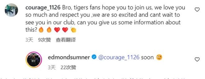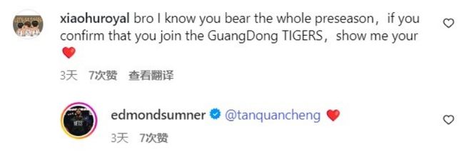 如今萨姆纳在社媒与网友互动时,他被网友问到希望他能够加盟广东男篮。萨姆纳本人确认表示“很快”。另一位网友表示如果确认将加盟广东男篮就贴出一个红心表情,萨姆纳也是回复一个红心表情进行确认。