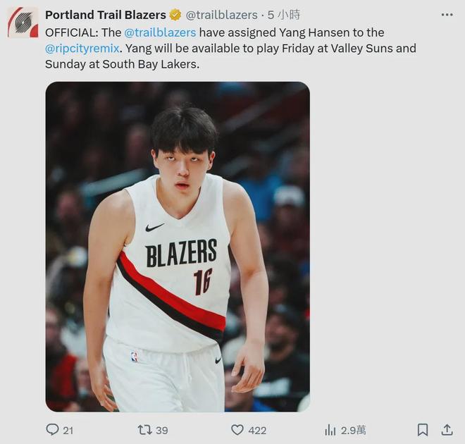 终于,开拓者在今天官宣,再度将杨瀚森下放到NBA发展联盟的撕裂之城混音队。