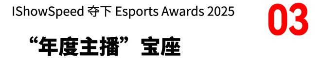 IShowSpeed 在 11 月 19 日于 Las Vegas 举行的 Esports Awards 2025 上,获颁 Streamer of the Year 年度主播,力压 Kai Cenat、jasontheween、Plaqueboymax、ExtraEmily 等一众强劲对手。