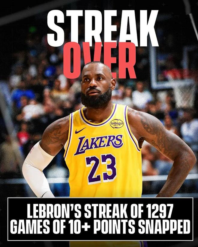 是的,詹姆斯的连续1297场得分上双纪录在今天终结了,他上一次得分不上双还要回到2007年,现役有99%的球员还没有进入NBA。