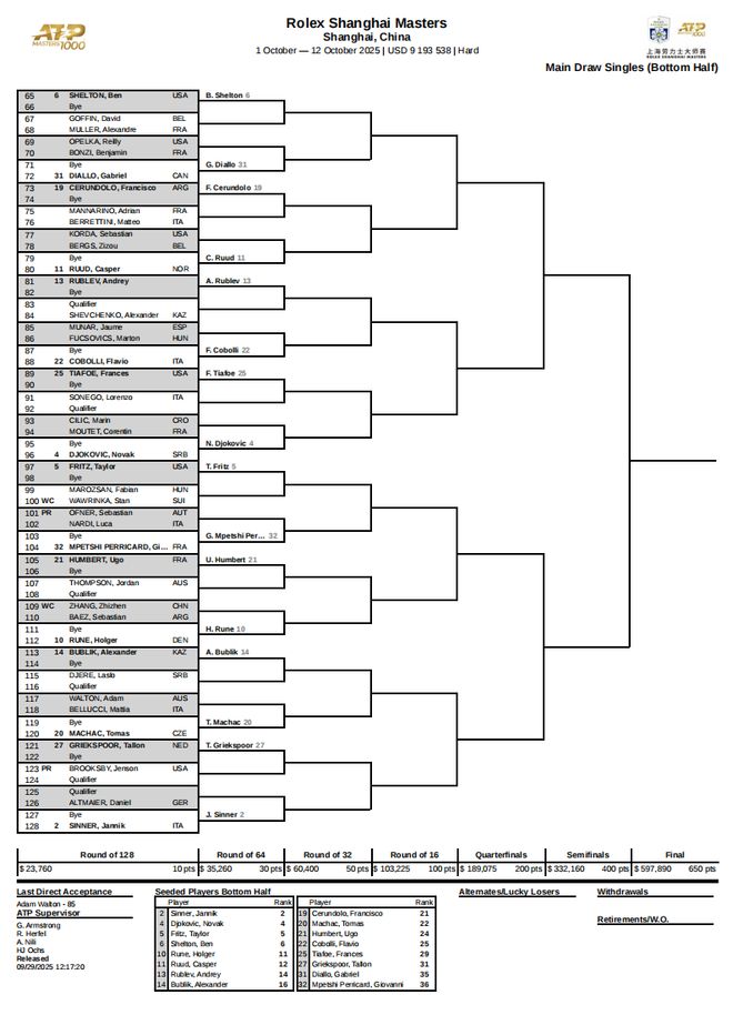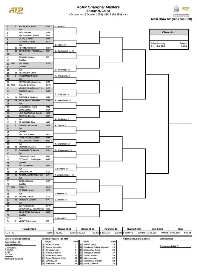 最终的正赛签表之中,头号种子阿尔卡拉斯与2号种子分别镇守上下半区,前八号种子的对位情况是:阿尔卡拉斯vs德米纳尔、兹维列夫vs穆塞蒂、谢尔顿vs德约科维奇、弗里茨vs辛纳。