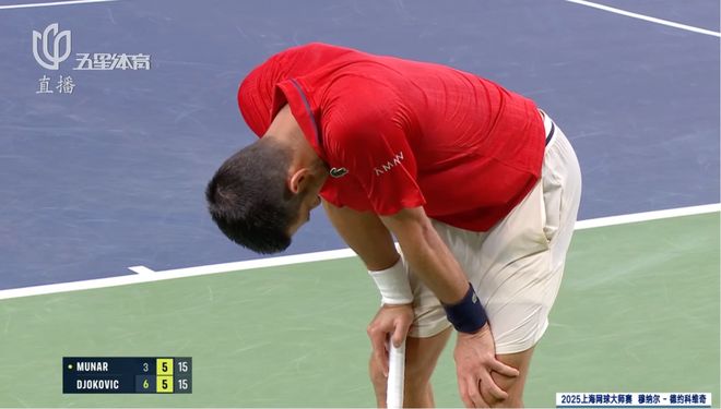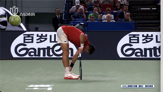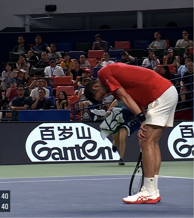 短暂的休息后,38岁的老将依然选择继续战斗,但是体能已经亮起了红灯。几乎每打完一分,德约就需要双手撑着膝盖缓上一口气。