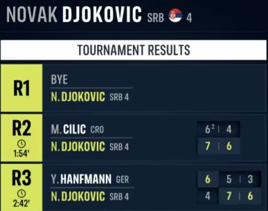前两轮,德约科维奇分别战胜克罗地亚老将西里奇以及德国选手汉夫曼,但两场比赛加起来耗时接近5个小时,体能对于38岁的德约来说是个不小的考验。