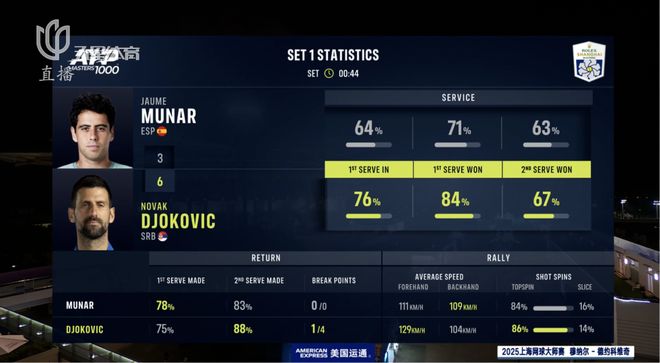 而在自己的接发轮,德约科维奇也不想与穆纳尔做过多缠斗,主动变线进攻,每一分的回合数都在三拍左右。首盘6比3,德约耗时50分钟,1比0取得领先,这一盘中,塞尔维亚名将在自己的发球局总共就丢了5分。