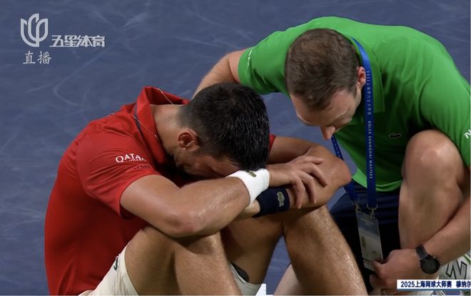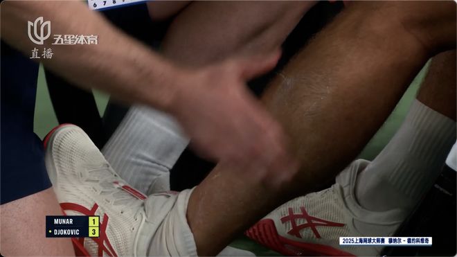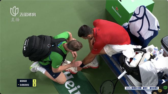 第二盘前11局,双方互相保发,来到德约非保不可的发球局,德约被穆纳尔破发的瞬间,这位38岁的老将无奈躺在了地上。盘间休息,理疗师上前为德约开始量血压……双方大比分来到1比1,对于德约而言,再打一盘简直是噩梦……