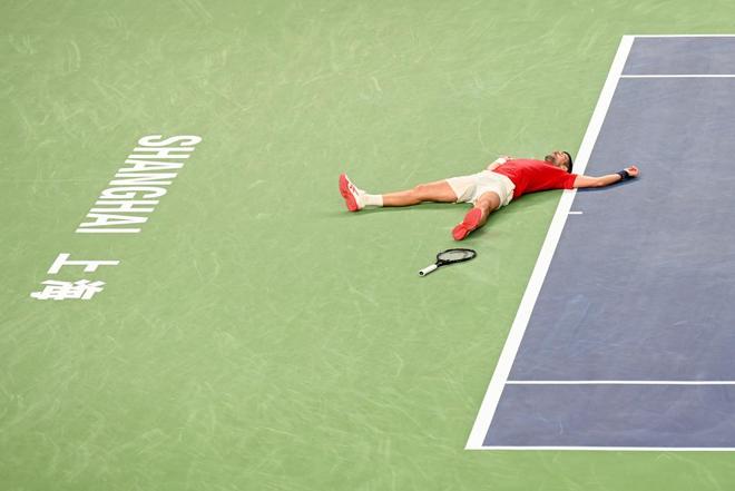 2025年10月7日,上海,久事体育场馆旗忠网球中心,输掉第二盘比赛后德约科维奇躺在场地上。澎湃新闻记者 朱伟辉 图