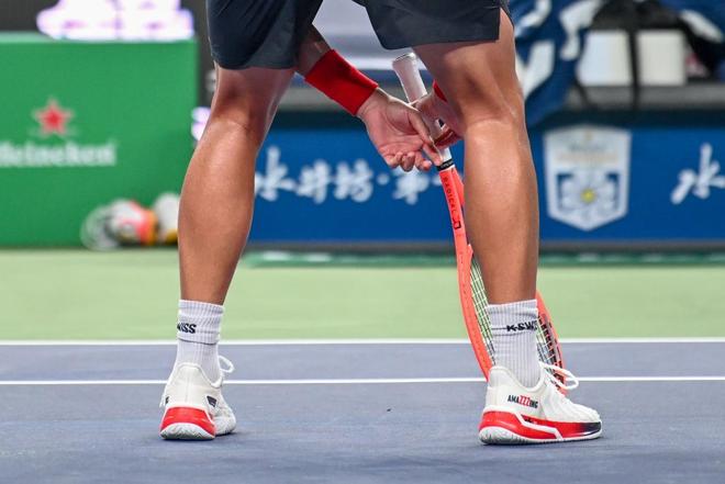 2025年10月1日,上海,久事体育场馆旗忠网球中心,比赛中张之臻感到腿部不适。澎湃新闻记者 朱伟辉 图