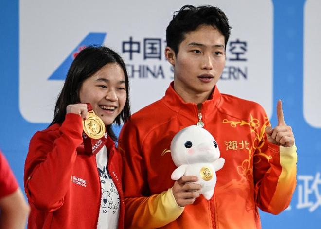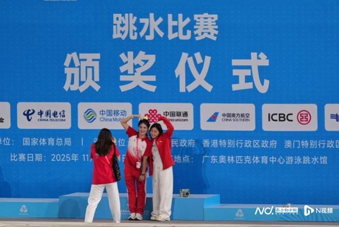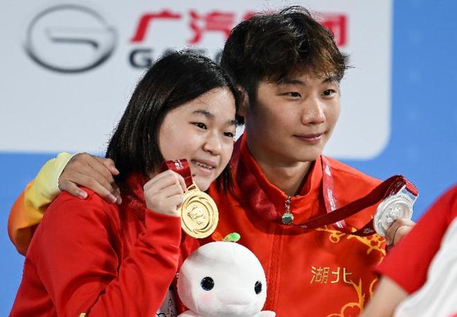 在颁奖仪式后,全红婵还调皮地挂着王宗源的金牌与人合影。