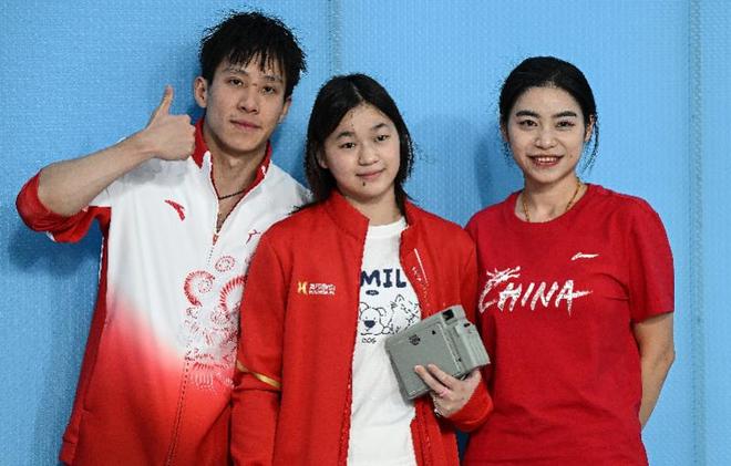 何超(左)、全红婵(中)及湖北省跳水队领队、奥运冠军刘蕙瑕合影。新华社发