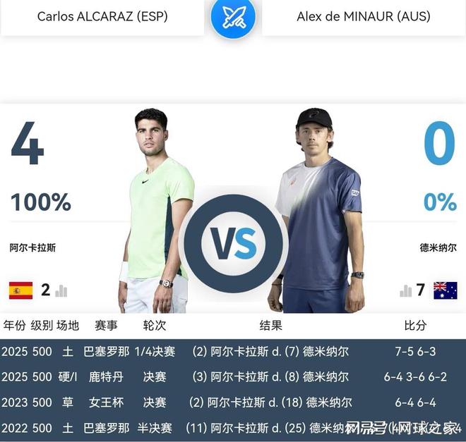 果然,昨晚首场比赛中,德-米纳尔给阿尔卡拉斯制造了很大的麻烦。虽然最后比分是6:7 2:6,德-米纳尔输掉了两人职业生涯第五次交锋,但是阿尔卡拉斯绝对不是两盘完胜对手,而是艰难获胜,特别是第一盘抢七,赢得惊险无比。
