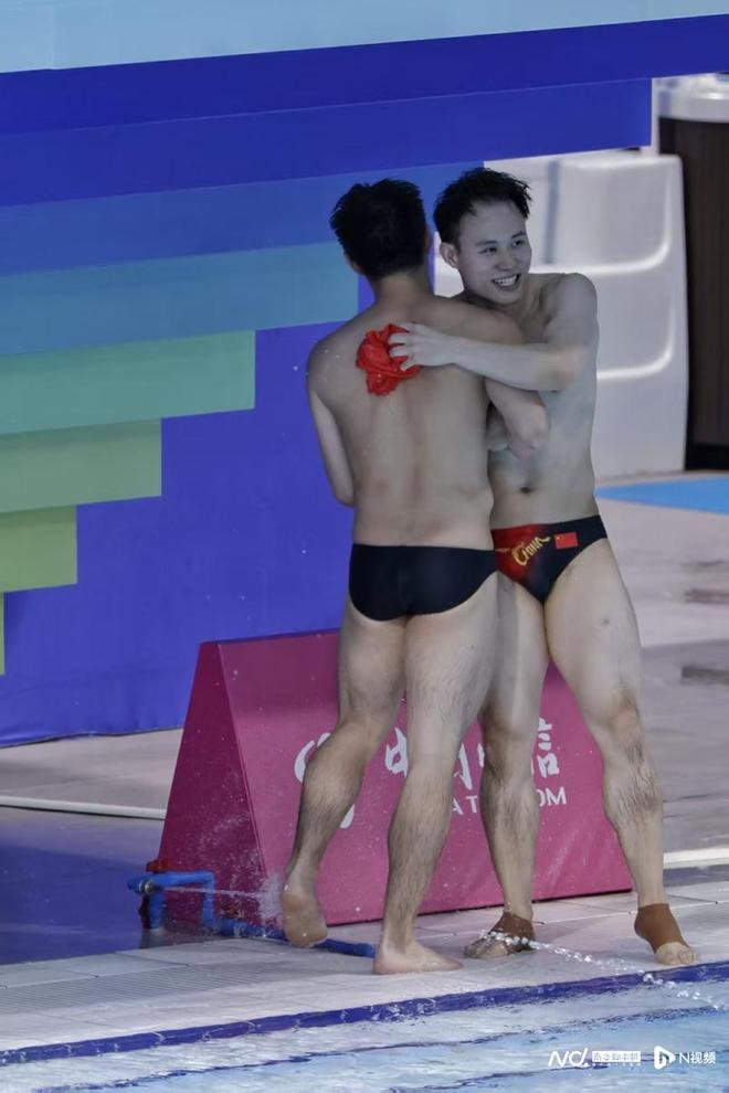 拿下男子双人三米板冠军后,谢思埸拥抱搭档黄博文。