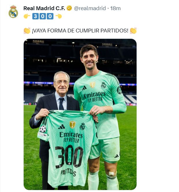 赛前,皇马主席弗洛伦蒂诺赠送库尔图瓦一件300场纪念球衣。皇马官方社媒晒出两人合照,并对库尔图瓦表示了祝贺:“以这样的方式完成这场比赛,太棒了!”