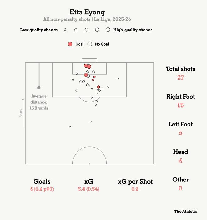 自从埃永在比利亚雷亚尔完成西甲首秀以来,他平均每146分钟打入一球,并且在本赛季的12场顶级联赛中,只有4场比赛他没有取得进球或助攻(或两者皆有)。他显然知道如何将球送入网窝。
