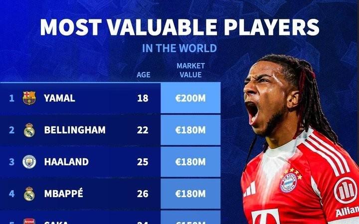 足坛最新身价榜:亚马尔2亿欧居首,奥利塞1.3亿欧位列第10