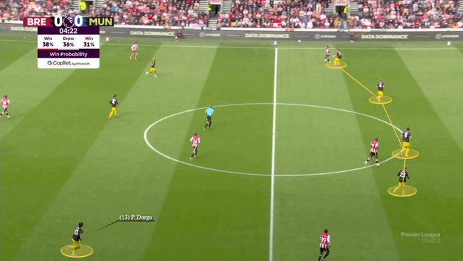 布伦特福德只有20%的进攻来自中路,创造本赛季这项数据最低纪录,说明从侧翼攻击曼联,就是他们的战术。不仅如此,该队还主要从本队右路进攻,瞄准多古防守的曼联左路。
