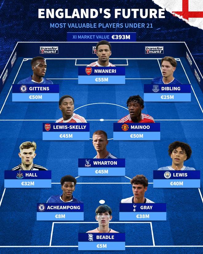 北京时间10月12日,德转市场更新英格兰U21身价最贵阵容,其中阿森纳球员恩瓦内里以5500万欧元居首。