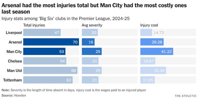 与此同时,单看上个赛季,他们的对手曼城在这项指标上损失最为惨重——尽管切尔西、阿森纳、曼联和托特纳姆热刺的伤病总数都更多。曼城遭遇了罗德里等关键球员的出勤问题,因此受到的打击更大。阿森纳主帅米克尔-阿尔特塔则不得不应对更多短期伤病,其中包括许多边缘球员。