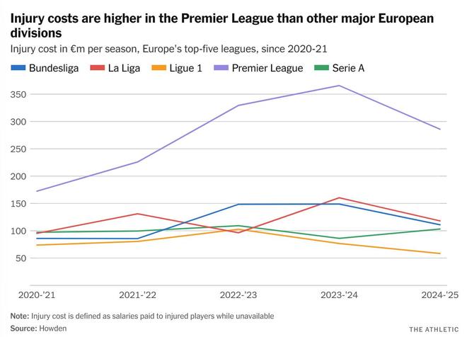 总计过去五个赛季,欧洲五大联赛的伤病“成本”总额接近30亿英镑(他们假设俱乐部向受伤球员全额支付工资),其中40%来自英超球员。