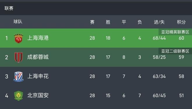 28轮战罢,上海海港60分领跑,成都蓉城59分第二,上海申花58分第三。同分情况下先比较胜负关系:蓉城优于海港和申花,海港优于申花。