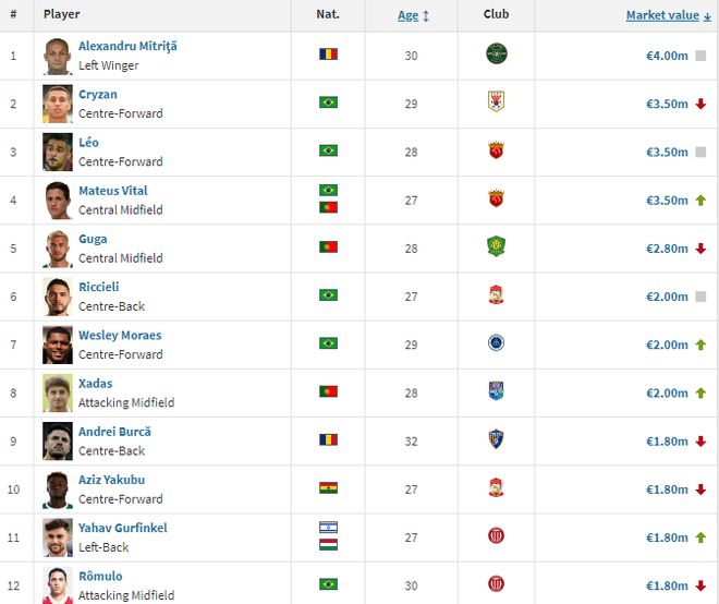 在中超球员身价排行榜上,克雷桑、莱昂纳多、维塔尔以350万欧元并列第二位,古加以280万欧元排名第4位,里切利、韦斯利、哈达斯以200万并列第6位,布尔克、阿齐兹、古尔芬克尔、罗慕洛的身价为180万欧元。其中,韦斯利、哈达斯身价分别上涨20万、50万欧元,布尔克、阿齐兹的身价分别下降70万、20万。