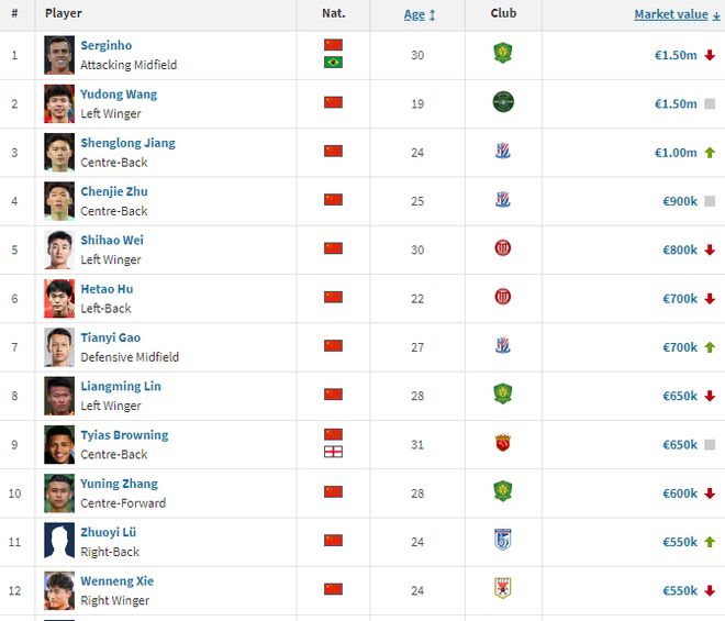 在本土球员里,塞尔吉尼奥、王钰栋以150万欧元排名榜首,其次是蒋圣龙(100万)、朱辰杰(90万),其中蒋圣龙身价上涨15万。几乎因伤缺席一年之后,武磊身价从120万下降到50万。